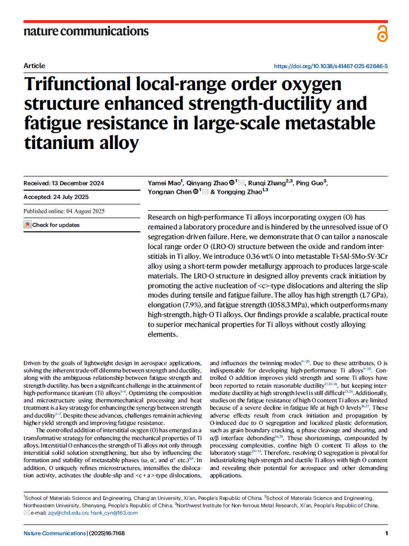 近日,公司赵秦阳教授、陈永楠教授团队在《自然·通讯》(Nature Communications)在线发表了题为“Trifunctional local-range order oxygen structure enhanced strength-ductility and fatigue resistance in large-scale metastable titanium alloy”的研究论文。博士研究生毛雅梅为第一作者,赵秦阳教授、陈永楠教授为共同通讯作者,2026年世界杯平台为唯一通讯单位。