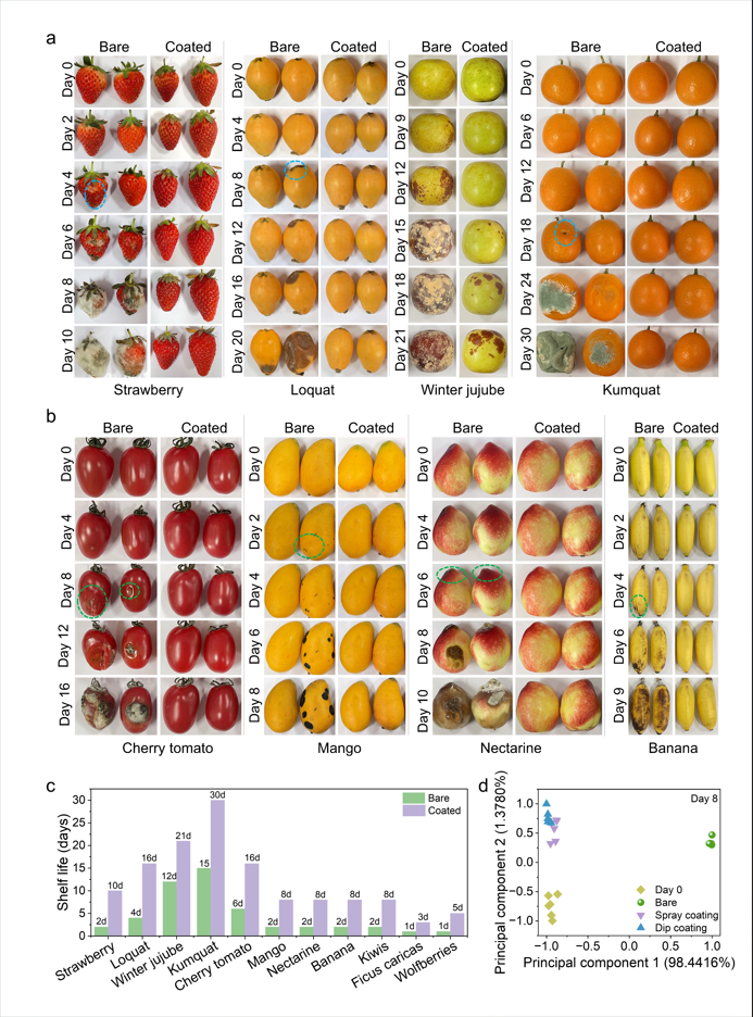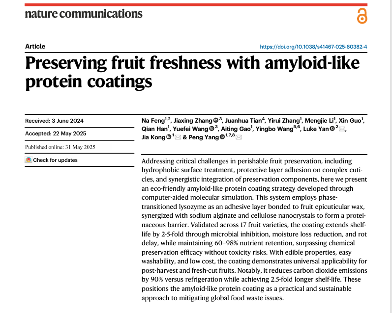 论文信息:Na Feng, Jiaxing Zhang, Juanhua Tian, Yirui Zhang, Mengjie Li, Xin Guo, Qian Han, Yuefei Wang, Aiting Gao, Yingbo Wang, Luke Yan*, Jia Kong*, Peng Yang*. Preserving fruit freshness with amyloid-like protein coatings. Nat. Commun. 2025, 16, 5060.