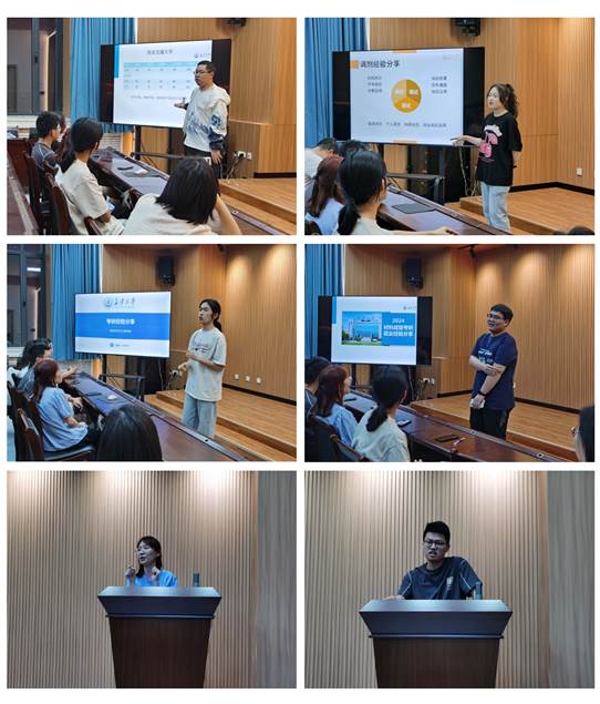 接下来,田天啸、师媖、单得财三位同学分别从考研择校、学科复习、专业面试等多个方向为大家详细分享考研过程中可能遇到的难题及经验技巧。然后,由闫琛、卢欣雨、陈宝瑞三位同学分别从行业选择、面试经验、简历投递及制作等多个角度为同学们切身分享其中的注意事项和心路历程。